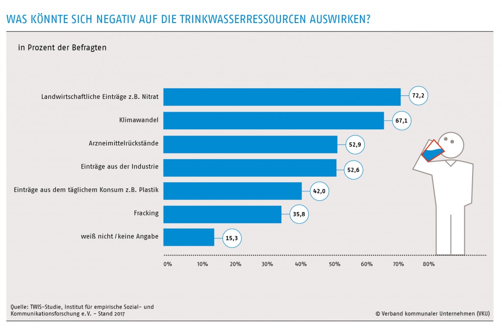 Das IESK (Institut für Sozial- und Kommunikationsforschung) belegt im Ergebnisbericht der Langzeitstudie„Qualität und Image von Trinkwasser in Deutschland (TWIS)“ , dass Wasserversorger auch im Hinblick auf Service und Preis gut bewertet werden. Allerdings registrieren die Menschen sehr genau die politischen Diskussionen um Spurenstoffe –insbesondere durch Arzneimittel – und die zu hohen Belastungen durch die Landwirtschaft!
